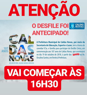 Desfile CívicoJornal Tribuna Livre 19 de out. de 20181 min de leituraDevido à previsão de pancadas de chuvas no final da tarde, o desfile cívico da cidade de Caldas Novas, será antecipado para às 16:30 horas, 44429103_688477611536660_200729905078468jornalhoraextra.com1409946549 participem.