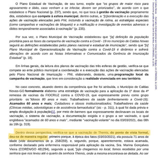 Ainda nos autos extrajudiciais, o atual secretário da saúde municipal, Dr. João Osorio informou, que a senhora Themis é paciente idosa com 71 anos de idade, que se encontrava acamada, conforme especificado no público alvo da campanha, tudo conforme estabelece os programas Federal e Estadual de Vacinação e também o Plano Municipal de Operacionalização da Vacina contra a Covid-19 de Caldas Novas.